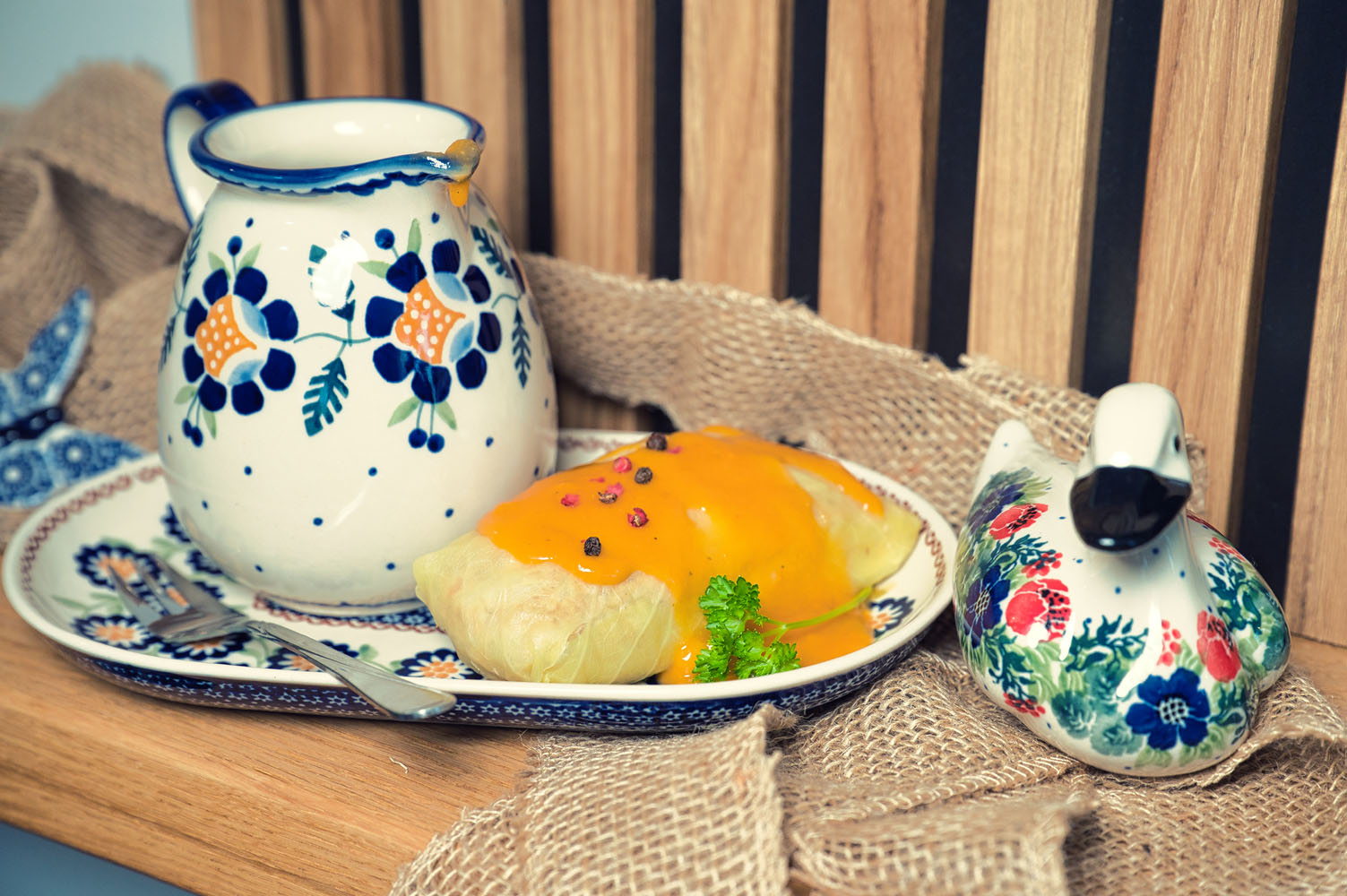 Każdy gołąbek jest ręcznie zawijany, tworząc perfekcyjną, zwartą formę, w której kapusta otula aromatyczny farsz, zachowując soczystość i delikatność.